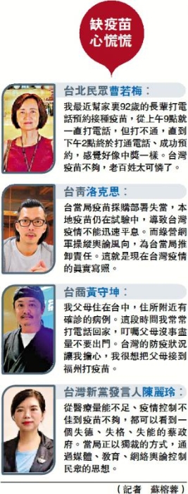我最近幫家里92歲的長輩打電話預(yù)約接種疫苗,從上午9點就一直打電話,但打不通,直到下午2點終于打通電話、成功預(yù)約,感覺好像中獎一樣。臺灣疫苗不夠,老百姓太可憐了。