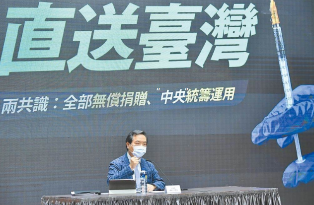臺(tái)行政機(jī)構(gòu)舉行BNT疫苗捐贈(zèng)記者會(huì),只見正“中央”原廠制造、原廠標(biāo)簽和大大的“直送臺(tái)灣”字樣,右下角寫著兩點(diǎn)共識(shí)——全部無償捐贈(zèng)、“中央”統(tǒng)籌分配;完全不見感謝捐贈(zèng)者鴻海永齡基金會(huì)和臺(tái)積電的字樣。(美聯(lián)社)