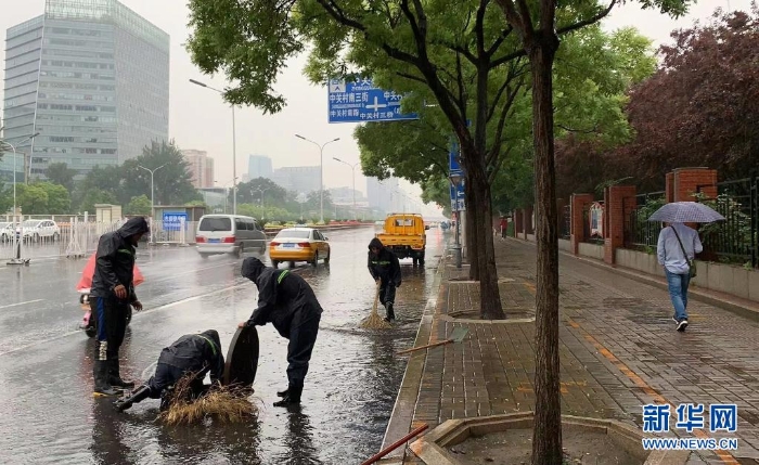 7月18日,在北京市中關村北四環(huán)西路,中關村街道工作人員清掃積水,打開下水井蓋加速排水(手機照片)。