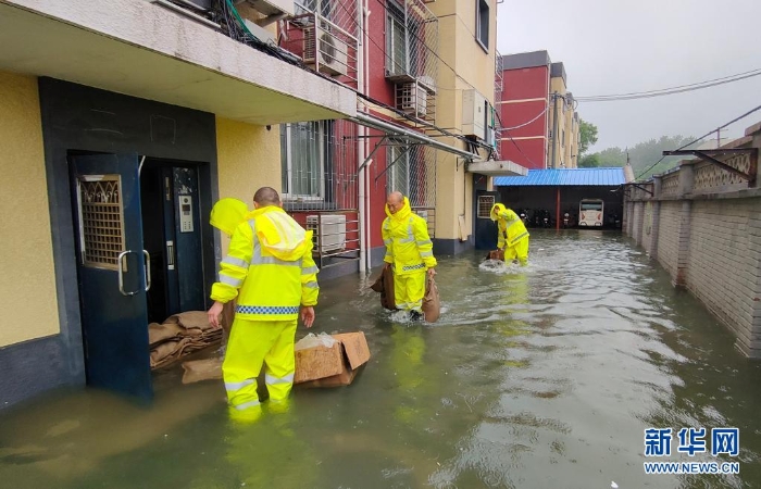 7月18日,北京市海淀區(qū)蘇家坨鎮(zhèn)水務站的工作人員在居民區(qū)處理積水(手機照片)。