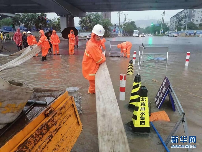 7月18日,北京排水集團工作人員在北京市石景山區(qū)金安橋路段緊急抽排積水。