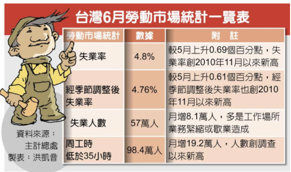 臺(tái)灣6月勞動(dòng)市場(chǎng)統(tǒng)計(jì)一覽表。圖片來(lái)源:臺(tái)灣《中國(guó)時(shí)報(bào)》