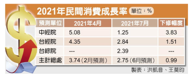 5月本土疫情爆發(fā),全臺三級警戒長達(dá)69天,內(nèi)需產(chǎn)業(yè)受重傷,使得今年原本看好的民間消費大為失色,“中經(jīng)院”下修幅度達(dá)3.83個百分點。