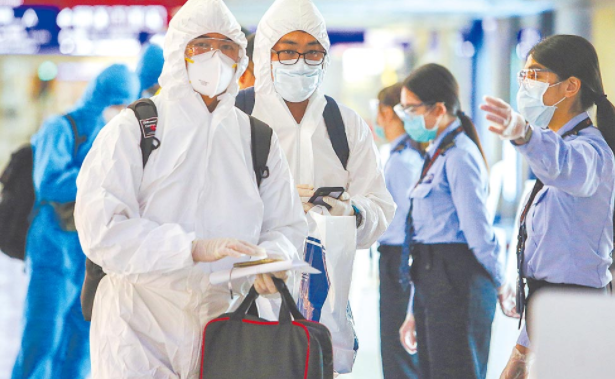 全臺(tái)27日起將從三級(jí)警戒降至二級(jí),疫情指揮中心25日公布新增12例本土案例。圖為桃園機(jī)場旅客穿著全身防護(hù)衣入境。(圖片來源:臺(tái)灣《中國時(shí)報(bào)》)