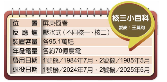 因新冠本土疫情沖擊,“核四公投”延至12月中,外界關切核四應否重啟問題間,核三將依臺灣地區(qū)“核子反應器設施管制法”第23條規(guī)定于今日向“原能會”提出除役計劃。核三廠2部機組,分于1984年、1985年啟用,有別于核一、核二,是臺灣唯一使用壓水式反應爐,裝置容量各95.1萬瓦,年發(fā)電量共逾140億度電,運轉以來,累計發(fā)電量逾5000億度電。
