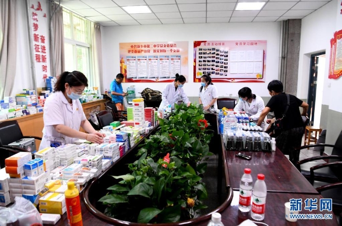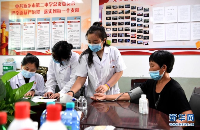 7月25日,醫(yī)護(hù)人員在河南省新鄉(xiāng)市第二中學(xué)臨時醫(yī)療救助點(diǎn)為轉(zhuǎn)移村民測量血壓。