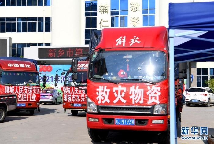 這是7月25日在河南省新鄉(xiāng)市第二中學(xué)安置點(diǎn)拍攝的物資運(yùn)輸車輛。