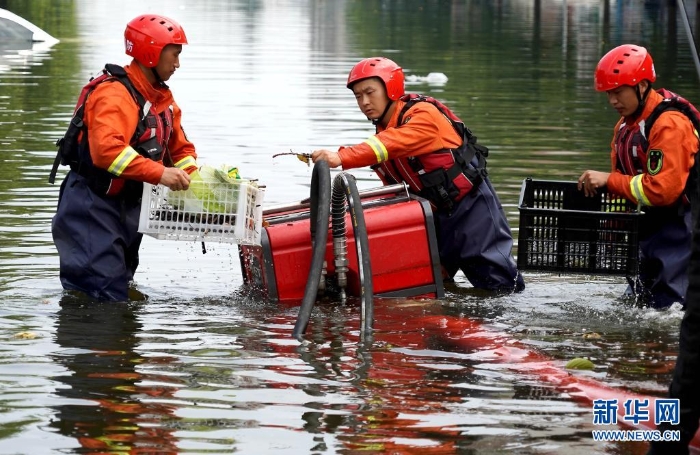 7月27日,江蘇省淮安市消防救援支隊救援人員在衛(wèi)輝市區(qū)進行排澇作業(yè)。近日,受持續(xù)強降雨影響,河南省新鄉(xiāng)衛(wèi)輝市城區(qū)積水嚴重。目前,救援人員正在積極開展排澇作業(yè)。新華社記者 李安 攝