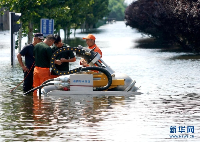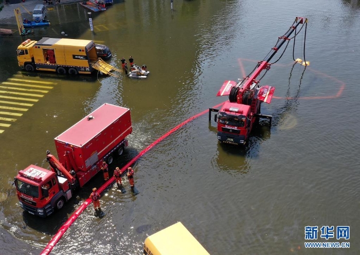 7月27日,救援人員在衛(wèi)輝市區(qū)架設排澇設備。近日,受持續(xù)強降雨影響,河南省新鄉(xiāng)衛(wèi)輝市城區(qū)積水嚴重。目前,救援人員正在積極開展排澇作業(yè)。新華社記者 李安 攝