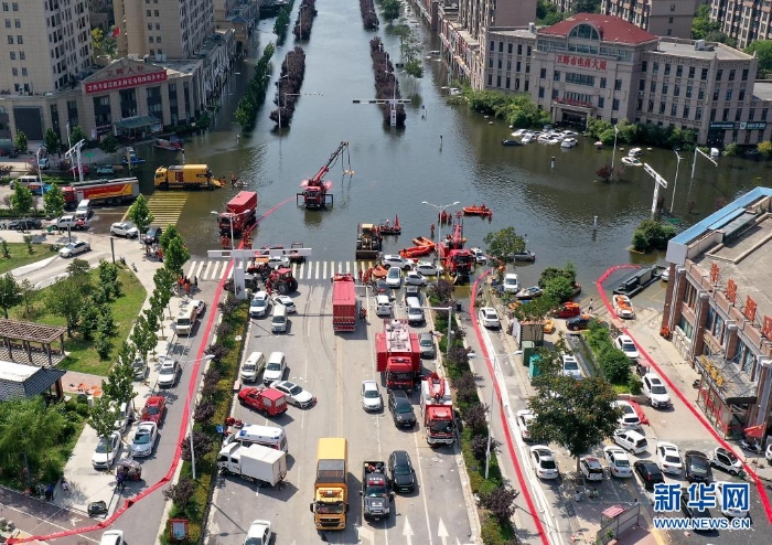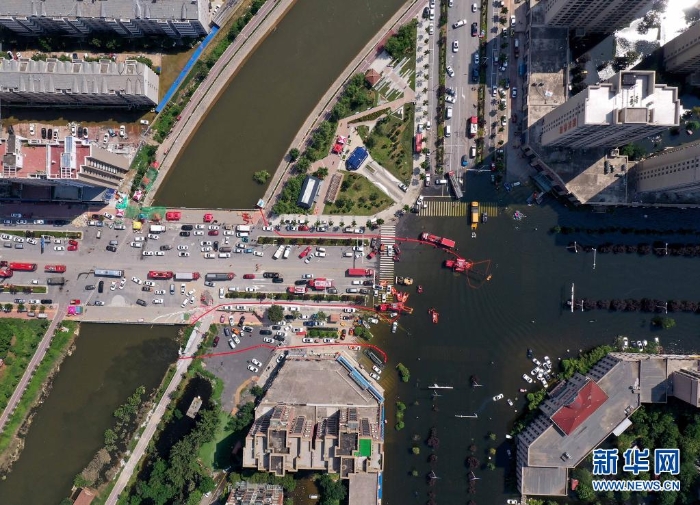 7月27日,救援人員在衛(wèi)輝市區(qū)進行排澇作業(yè)(無人機照片)。近日,受持續(xù)強降雨影響,河南省新鄉(xiāng)衛(wèi)輝市城區(qū)積水嚴重。目前,救援人員正在積極開展排澇作業(yè)。新華社記者 李安 攝
