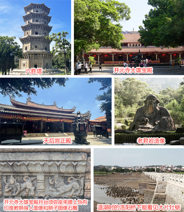 22處代表性古跡遺址包括:九日山祈風(fēng)石刻、市舶司遺址、德濟(jì)門遺址、天后宮、真武廟、南外宗正司遺址、泉州府文廟、開元寺、老君巖造像、清凈寺、伊斯蘭教圣墓、草庵摩尼光佛造像、磁灶窯址、德化窯址、安溪青陽下草埔冶鐵遺址、洛陽橋、安平橋、順濟(jì)橋遺址、江口碼頭、石湖碼頭、六勝塔、萬壽塔。