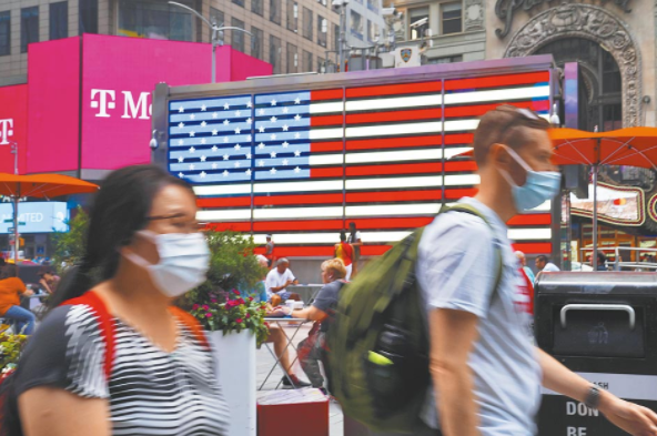 美國(guó)新冠疫情反彈,圖為人們戴著口罩在紐約時(shí)報(bào)廣場(chǎng)走動(dòng)。華盛頓大學(xué)研究推估,美國(guó)實(shí)際染疫的人可能多達(dá)6500萬(wàn)人,將近總?cè)丝诘奈宸种弧#ㄐ氯A社資料照片)
