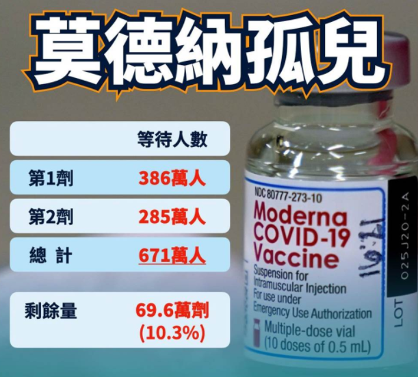 王鴻薇指出,目前臺灣疫苗已捉襟見肘,莫德納庫存至昨天僅剩69.6萬劑,但是在預約平臺尚有386萬人獨鐘莫德納,這些民眾從第一輪等到第五輪,身邊的同學,同事,朋友都已經打完了,他們還以為很快就輪到他們。除了苦等第一劑的莫迷,之前已施打第一劑莫德納的285萬人,因為臺當局尚未開放混打,國際間也少有第一劑莫德納打完混打其他疫苗的研究,這些人也在等待第二劑莫德納。那么,3個月內,臺灣會來多少莫德納?
