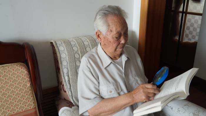 離休之后,郭瑞祥堅持理論學習,相關的書籍翻了又翻。他認為只有堅持學習黨的最新理論,才能在政治上跟緊時代的步伐。隨著年齡的增長,原先只戴老花鏡看書的郭瑞祥,現(xiàn)在還得右手拿著放大鏡。