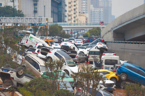 河南強降雨致302人遇難,其中鄭州市高達292人。圖為日前鄭州市大雨,街道淹水嚴重導致大量汽車拋錨。(新華社)