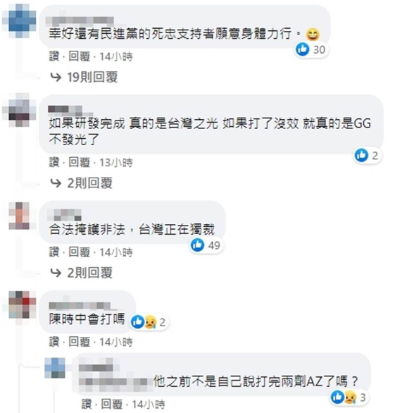 不僅如此,也有網(wǎng)友表示:“期待蔡英文直播打高端”、“高端是留給支持民進(jìn)黨的年輕人打。因?yàn)槊襁M(jìn)黨根本沒幫年輕人買疫苗。所以請(qǐng)支持民進(jìn)黨的年輕人勿打民間團(tuán)體買的BNT疫苗”、“幸好還有民進(jìn)黨的死忠支持者愿意身體力行”。