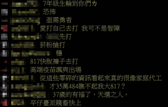 高端疫苗封緘檢驗(yàn)相關(guān)議題,在批踢踢論壇與不少臉書貼文下引發(fā)網(wǎng)友討論,尤其第5批共近8.7萬(wàn)劑通過檢驗(yàn),更讓網(wǎng)友為之熱議,紛紛在臉書相關(guān)新聞下留言:“817一個(gè)都別給我跑!”、“817們還在等什么?上吧!”、“臺(tái)灣價(jià)值快獻(xiàn)上你們的手臂”、“臺(tái)灣之光出現(xiàn)了”、“可以先補(bǔ)上官網(wǎng)的保護(hù)力數(shù)據(jù)嗎?”、“這樣問陳時(shí)中,會(huì)響應(yīng)你是不健康的問題”。