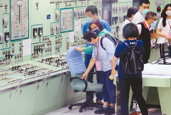 臺電第二核能發(fā)電廠(核二廠)2號機7月27日因一把椅子觸碰到保護蓋,致使主蒸汽隔離閥關閉引發(fā)跳機意外?!傲⑽?日到核二廠考察并實勘,了解事故發(fā)生原因及改善狀況,并在模擬控制室還原事發(fā)經過。圖片來源:臺灣《中國時報》