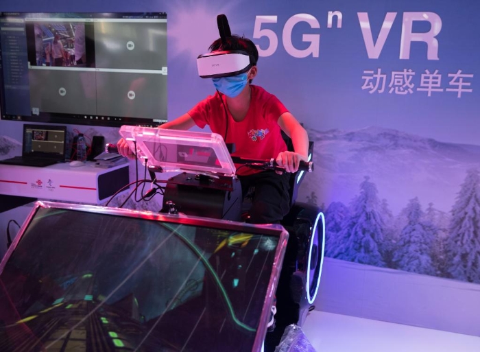 在2021中國國際大數(shù)據(jù)產(chǎn)業(yè)博覽會(huì)展館,觀眾體驗(yàn)5G虛擬現(xiàn)實(shí)動(dòng)感單車。新華社記者 金立旺 攝
