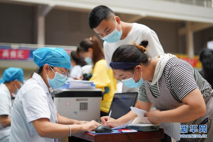 8月12日,在貴州省丹寨縣體育館接種點(diǎn),學(xué)生和家長(zhǎng)在確認(rèn)疫苗接種信息。