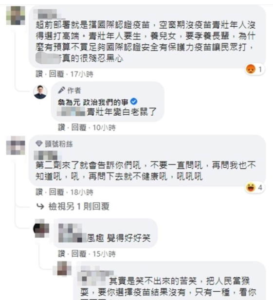 此文一出,網(wǎng)友紛紛留言:“我真的絕望了,不知道今年有可能打到第二劑嗎”、“事實就是缺疫苗,真的好絕望”、“超前部署就是擋國際認證疫苗,空窗期沒疫苗青壯年人沒得選打高端”、“青壯年人要生,養(yǎng)兒女,要孝養(yǎng)長輩,為什么有預算不買足夠國際認證、安全有保護力疫苗讓民眾打,民進黨真的很殘忍黑心”、“第二劑來了就會告訴你們吼,不要一直問吼,再問我也不知道吼,吼,再問下去就不健康吼,吼吼吼”。