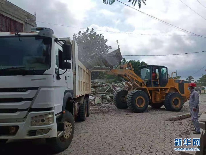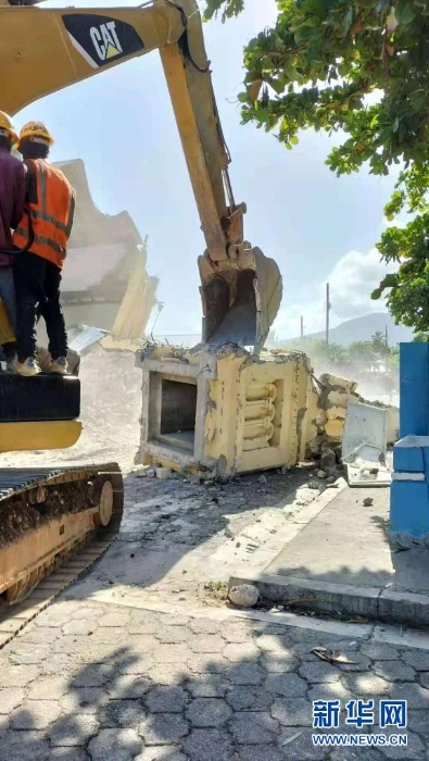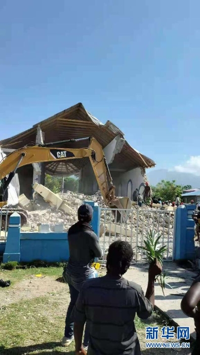 8月15日,救援人員在海地萊昂格萊清理廢墟。