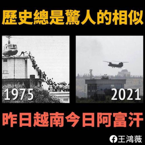 美軍狼狽撤僑的照片也隨之曝光,有島內網友把這一幕聯(lián)想到1975年美軍撤離越南西貢的畫面,不僅感嘆:“昨日越南,今日阿富汗,明日……?”而一直幻想“兩岸開戰(zhàn)美軍會來支持”的臺灣,未來可以仰賴美國的保護嗎?相信臺灣民眾內心都有答案了。