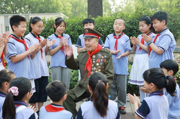 王占山(中)給少先隊(duì)員們講戰(zhàn)斗故事。圖源:新華社 戴丹華 攝