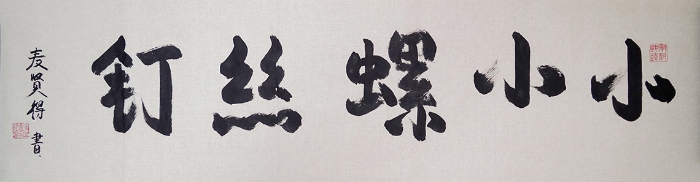 南國的夏日,悶熱而潮濕。當我們來到麥賢得家中時,正巧碰到幾位年輕的戰(zhàn)士來看望他。此時,桌上筆墨鋪陳,還未來得及面對面打招呼,就透過圍著麥老的人群縫隙,看到他提筆寫下一幅字——“小小螺絲釘”?! ?/p>