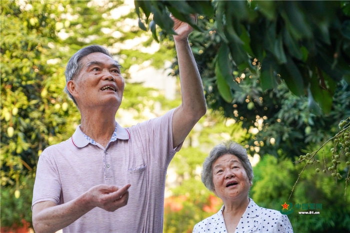 麥賢得與妻子李玉枝在小區(qū)里散步。解放軍報記者欒鋮 攝