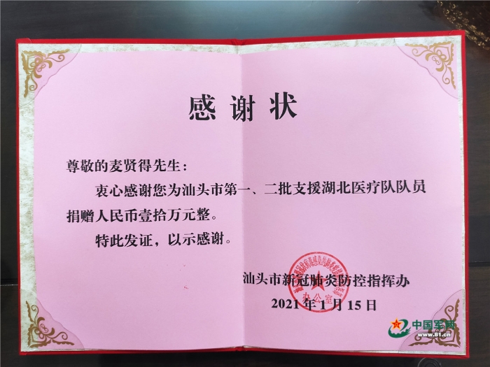 直到去年年底,汕頭市在進行抗擊新冠肺炎疫情經(jīng)驗總結及表彰工作時,幾經(jīng)尋找,才發(fā)現(xiàn),年初向汕頭援鄂醫(yī)療隊捐款10萬元的人就是麥賢得,“一個老兵”的落款在此時才浮出水面?! ?/p>