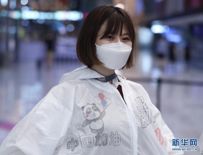 8月19日,在東京成田機場,一名國航工作人員身著為運動員加油打氣標語的防護服。
