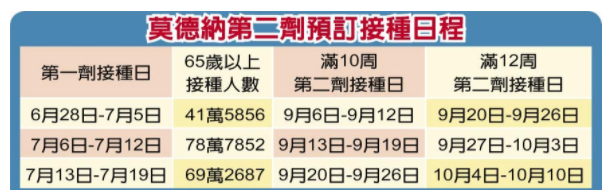 莫德納第二劑預(yù)訂接種日程。圖片來(lái)源:臺(tái)灣《中國(guó)時(shí)報(bào)》