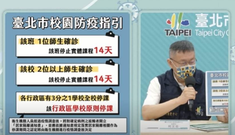 關(guān)于開學(xué)措施,柯文哲說,這次疫情還算控制,原則上實體上課,小朋友同學(xué)回學(xué)校上課了,請防疫假的傾向在教室后面掛攝影機(jī),在線線下教學(xué)。萬一一個班級有一位師生確診,當(dāng)然全班居隔14天,2位以上師生確診,就全校停止14天上課,這部分到時候看狀況決定。