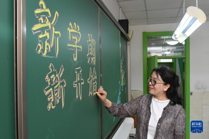 8月26日,在北京市海淀區(qū)太平路小學(xué),教師在教室里書寫新學(xué)期寄語。