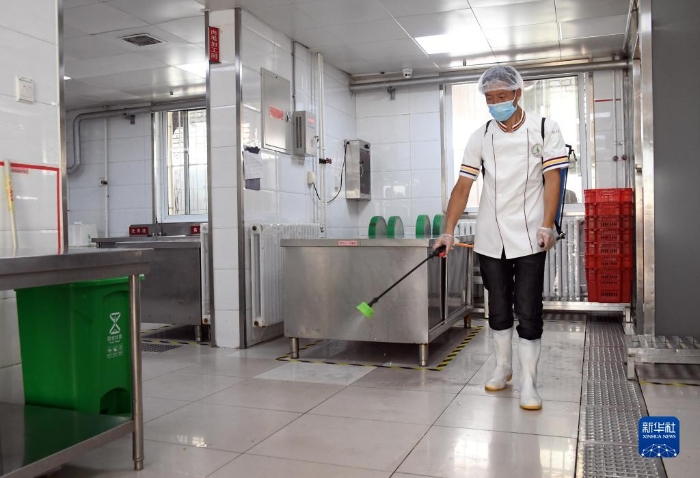 8月26日,在北京市海淀區(qū)太平路小學(xué),工作人員對食堂廚房進行消毒。
