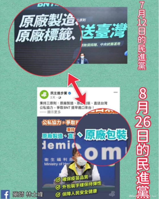 林士峰在臉書(shū)PO文先是提到,民進(jìn)黨8月26日發(fā)文告訴全體民眾,會(huì)秉持三原則“原廠制造、原廠包裝、直送臺(tái)灣”,爭(zhēng)取BNT提早進(jìn)口來(lái)臺(tái)。但他發(fā)現(xiàn),綠營(yíng)上個(gè)月告訴大家的三原則并非如此。