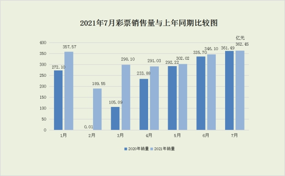 中新網(wǎng)8月30日電 財政部網(wǎng)站30日公布2021年7月份全國彩票銷售情況,數(shù)據(jù)顯示,7月份,全國共銷售彩票362.45億元*,比上年同期(簡稱“同比”)增加0.96億元,增長0.3%。其中,福利彩票機(jī)構(gòu)銷售112.54億元,同比減少41.82億元,下降27.1%;體育彩票機(jī)構(gòu)銷售249.91億元,同比增加42.79億元,增長20.7%。