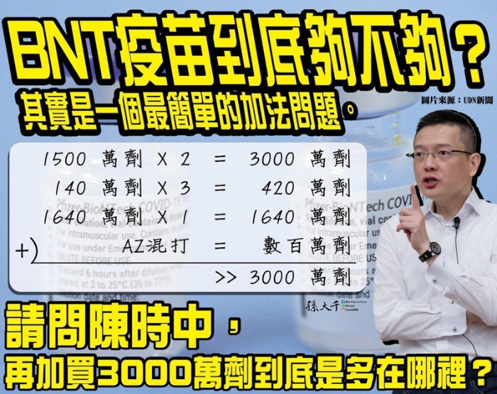 孫大千說,臺灣現(xiàn)在滿打滿算也只不過買到了1500萬劑的BNT疫苗,請問疫情流行指揮中心指揮官陳時(shí)中,再加買3000萬劑到底是多在哪里了?