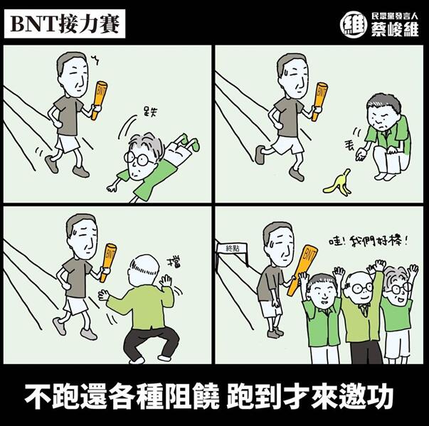 蔡峻維在臉書發(fā)布漫畫諷刺這才是“民進(jìn)黨的BNT接力賽”。