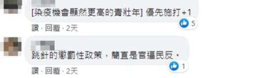 此文發(fā)出后獲得4000個贊、近百則留言與超過120次分享。臺灣網(wǎng)友紛紛回應:“跳針的懲罰性政策,簡直是官逼民反”、“我是迫切需要疫苗的族群,但是,每次剛好都被跳過”、“民眾卻如同在走暗棋、永遠不知道下一步遇到什么?”、“今天的新聞真是讓人百感交集,許多人還在苦等第一劑,卻已經(jīng)有人在想要打第三劑”、“民進黨考慮的是選票,不是一般民眾的生死”。