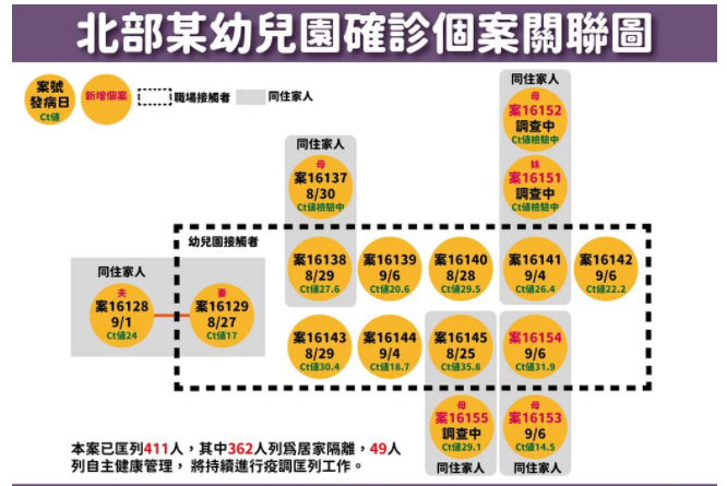 幼兒園確診個(gè)案關(guān)聯(lián)圖。(圖/指揮中心提供)