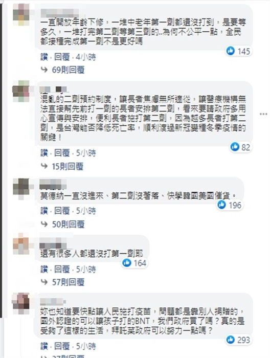 不過,貼文曝光后,有數(shù)千名網(wǎng)友涌入蔡英文社交賬號留言,“一直開放年齡下修,一堆中老年第一劑都還沒打到,是要等多久,一堆打完第二劑等第三劑的..為何不公平一點(diǎn),全民都接種完成第一劑不是更好嗎?”、“莫德納一直沒進(jìn)來、第二劑沒著落、快學(xué)韓國美國催貨”、“你也知道要快點(diǎn)讓民眾施打疫苗,問題都是靠別人捐贈的,海外認(rèn)證的可以讓孩子打的BNT,我們當(dāng)局買了嗎?真的是受夠了這樣的生活,可以拜托蔡當(dāng)局努力一點(diǎn)嗎?”