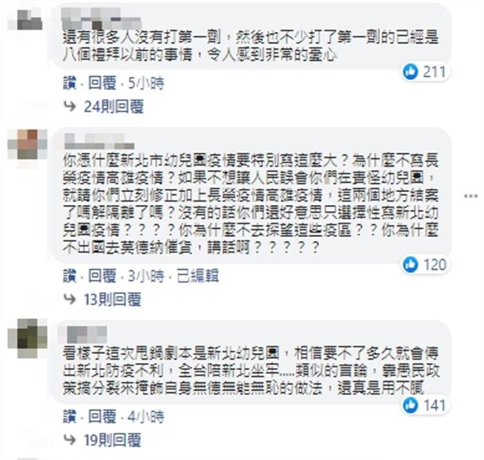 也有網(wǎng)友表示,“憑什么新北市幼兒園疫情要特別寫這么大?為什么不寫長榮疫情高雄疫情?如果不想讓民眾誤會你們在責(zé)怪幼兒園,就請你們立刻修正加上長榮疫情高雄疫情,這兩個地方結(jié)案了嗎解隔離了嗎?沒有的話你們還好意思只選擇性寫新北幼兒園疫情??”、“還有很多人沒有打第一劑,然后也不少打了第一劑的已經(jīng)是八個禮拜以前的事情,令人感到非常的憂心”。