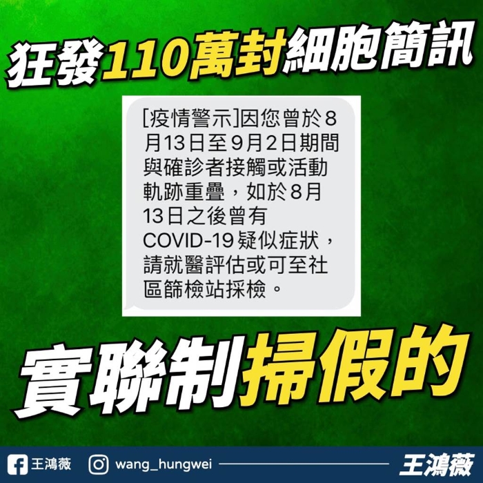 王鴻薇7日發(fā)文表示,島內(nèi)機(jī)師傳出突破性感染,指揮中心發(fā)出多達(dá)110萬封的細(xì)胞簡訊,只要在8月13日到9月2日間,與確診者足跡有重疊的民眾,都會收到警示。其區(qū)間長達(dá)2、3周,民眾收到簡訊根本搞不清楚狀況,也造成各地的篩檢站涌現(xiàn)人潮,“難道指揮中心在廣發(fā)簡訊前,都沒有先做好配套嗎?”
