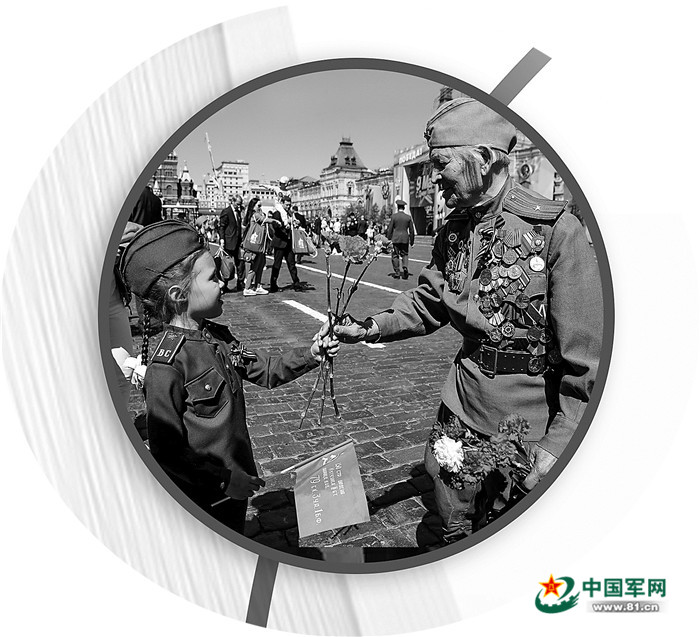 在俄羅斯莫斯科紅場(chǎng),一個(gè)女孩向老兵獻(xiàn)上鮮花。