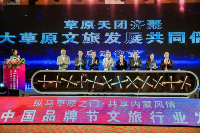在大草原文旅發(fā)展啟動(dòng)儀式上,在場(chǎng)嘉賓共同按下按鈕,為草原文旅品牌的打造按下了啟動(dòng)鍵。會(huì)場(chǎng)響起了熱烈的掌聲。