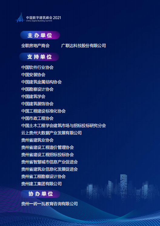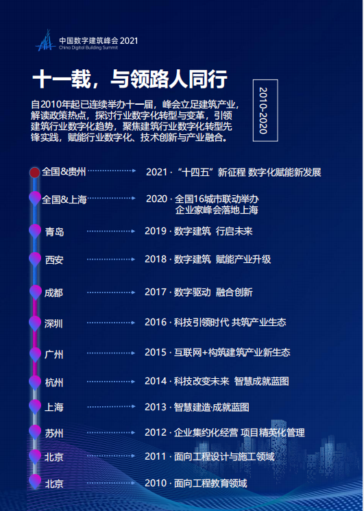 中國數(shù)字建筑峰會2021?城市峰會作為建筑行業(yè)重量級、綜合型的技術交流會議,旨在解讀政策熱點,探討行業(yè)數(shù)字化轉(zhuǎn)型與變革,引領建筑行業(yè)數(shù)字化趨勢,聚焦建筑行業(yè)數(shù)字化轉(zhuǎn)型先鋒實踐,賦能行業(yè)數(shù)字化、技術創(chuàng)新與產(chǎn)業(yè)融合,將攜手行管部門領導、專家,與建設方、施工方、中介咨詢、設計院、院校等諸多嘉賓共襄盛舉,共議數(shù)字化轉(zhuǎn)型行動與實踐,加速建筑行業(yè)轉(zhuǎn)型,助力中國建造高質(zhì)量發(fā)展。