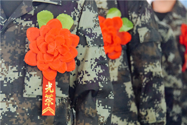 身著迷彩,胸佩紅花