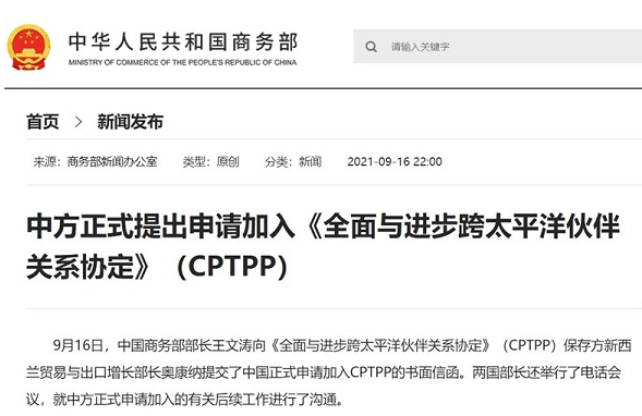 (評(píng)論員 胡志勇)9月16日,中國(guó)商務(wù)部部長(zhǎng)向《全面與進(jìn)步跨太平洋伙伴關(guān)系協(xié)議》(CPTPP)保存方新西蘭提交了書(shū)面信函,正式申請(qǐng)加入《全面與進(jìn)步跨太平洋伙伴關(guān)系協(xié)議》(CPTPP)。但是,CPTPP組織輪值主席國(guó)日本政府卻認(rèn)為有必要觀(guān)察中國(guó)是否能遵守CPTPP的高標(biāo)準(zhǔn)規(guī)則,對(duì)于中國(guó)的加入持慎重的立場(chǎng)。